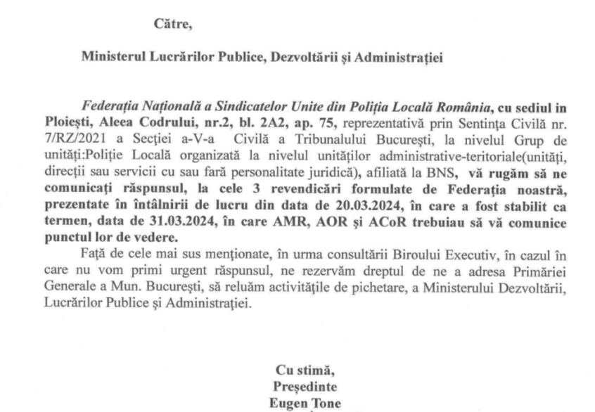 Am comunicat astăzi Ministerului Dezvoltării, Lucrărilor Publice şi Administraţiei că dacă, nu primim răspunsul la cele 3 revendicări principale ( încadrarea în condiții de muncă, acordarea obligatorie a drepturilor de hrană și plata compensației bănești, pentru munca prestată în weekend și sărbători legale), susţinute de Federaţia noastră la şedinta din 20.03.2024, de la sediul Ministerului, vom relua activităţile de protest.