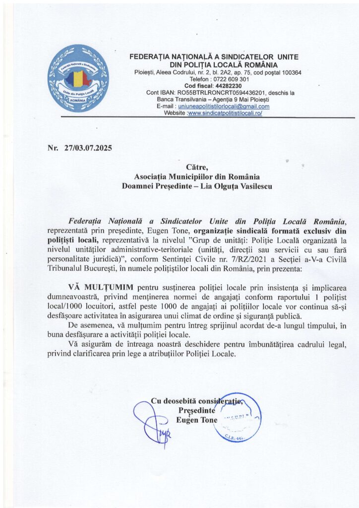Comunicat Consiliul Național Galați În data de 24 Mai 2025, s-a desfășurat la sediul Poliției Locale Galați, Consiliul Național al Federației Naționale a Sindicatelor Unite din Poliția Locală România, în prezența delegaților sindicatelor componente. Principale subiecte au vizat prezentarea acțiunilor Federației întreprinse în cursul anului 2024, prin pichetarea Ministerului Dezvoltării, […]