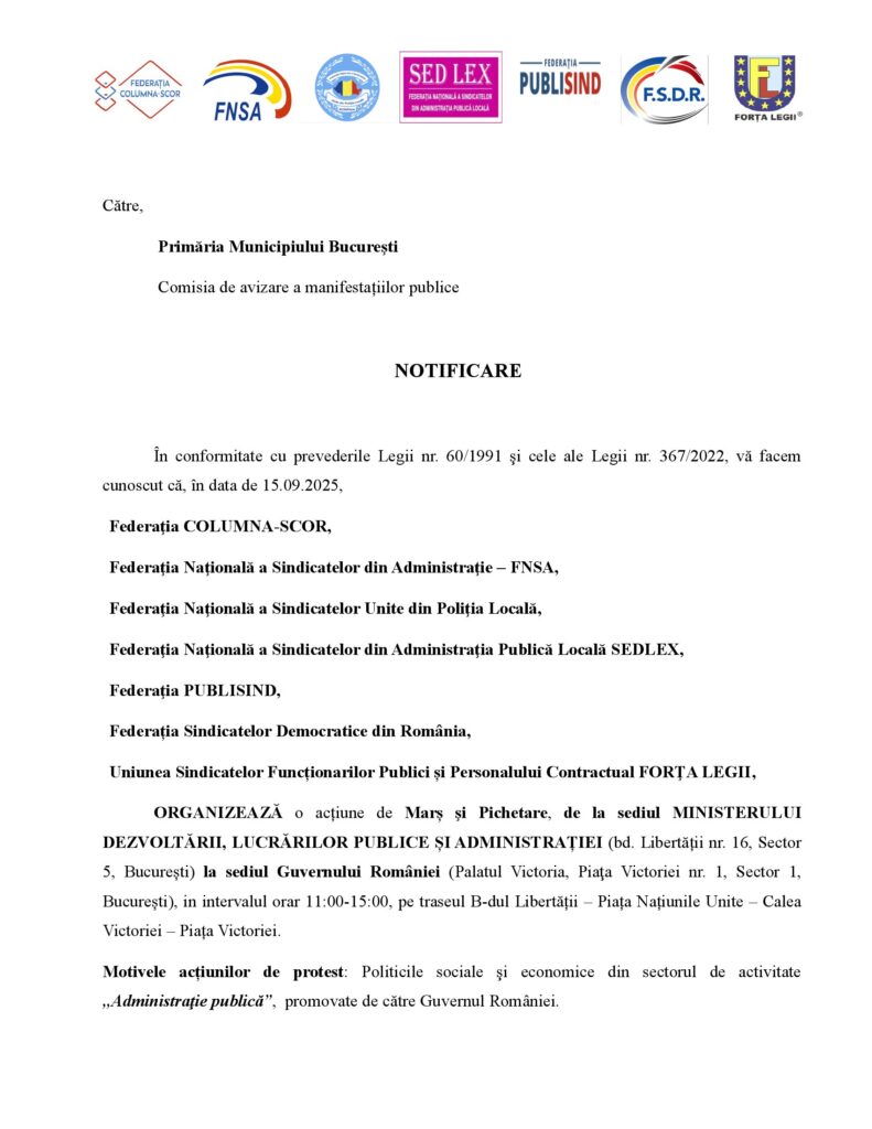 Programul de acţiuni comune, sincronizate cu federatiile reprezentative la nivelul sectorului de administratie publica, începe în data de 15 septembrie 2025 printr-un marș și o pichetare, în București, pe traseul Piata Victoriei – sediul Guvernului României – Parlamentul Romaniei între orele 11:00–15:00. Revendicări: 1. Consultarea reală a organizațiilor sindicale înainte de adoptarea „Pachetul nr. 2 […]