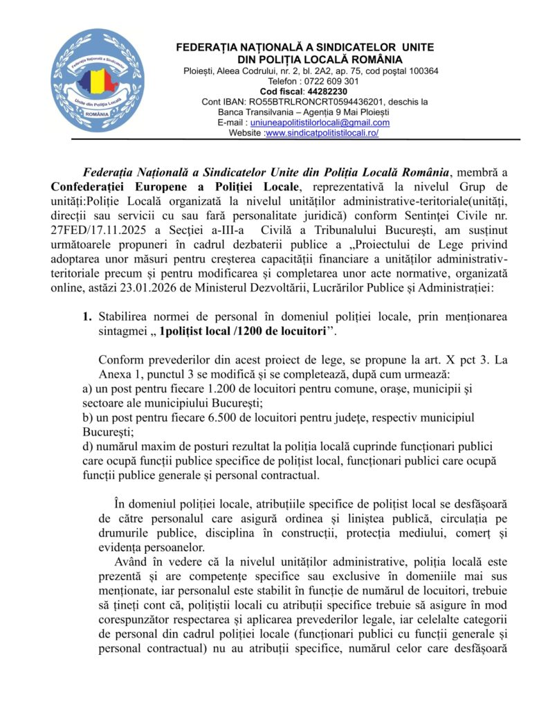 Federația Națională a Sindicatelor Unite din Poliția Locală România, membră a Confederației Europene a Poliției Locale, reprezentativă la nivelul Grup de unități:Poliție Locală organizată la nivelul unităților administrative-teritoriale(unități, direcții sau servicii cu sau fară personalitate juridică) conform Sentinţei Civile nr. 27FED/17.11.2025 a Secţiei a-III-a Civilă a Tribunalului Bucureşti, am susținut următoarele propuneri în cadrul dezbaterii […]